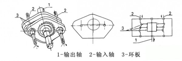 三环减速机基本型的工作原理如图所示,由一根具有外齿轮套接的低速轴1、二根由三个互呈120度偏心的高速轴2和三片具有内齿轮的环板3组成。减速时,高速轴2作为输入轴,带动环板3上的内齿轮做平面运动,靠内齿轮与低速轴1上的齿轮啮合实现大速比。齿型一般为渐开线齿型,各输入轴的轴端可单独或同时输入动力。