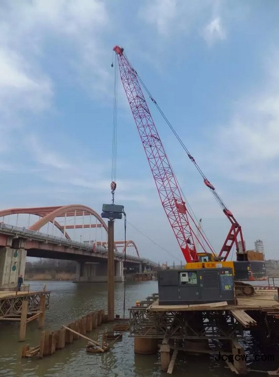 河里的防水围堰。通常选用更宽点的6号桩。锁口钢板桩的长度在15到24米之间,由416L型液压振动锤驱打。更复杂的可能含有砾石的土壤,可以选择中等大小的锤,如815C。围堰能为混凝土基础的修建提供干燥的码头。桥塔建成之后,钢板桩会被取出重新利用。