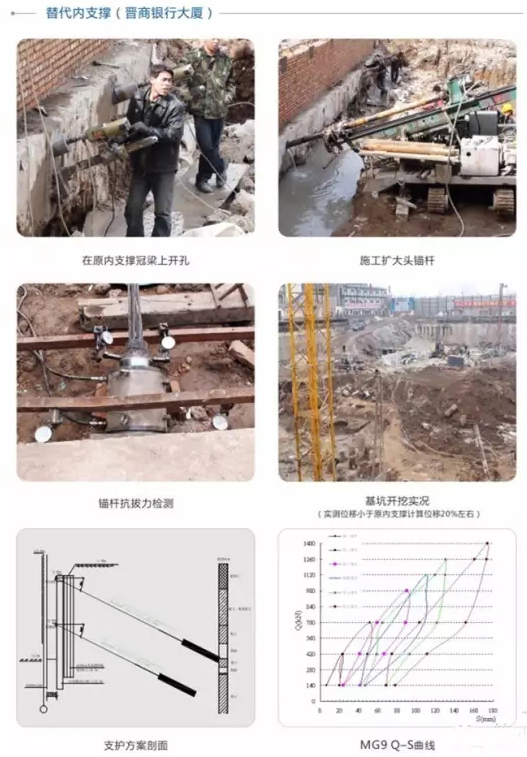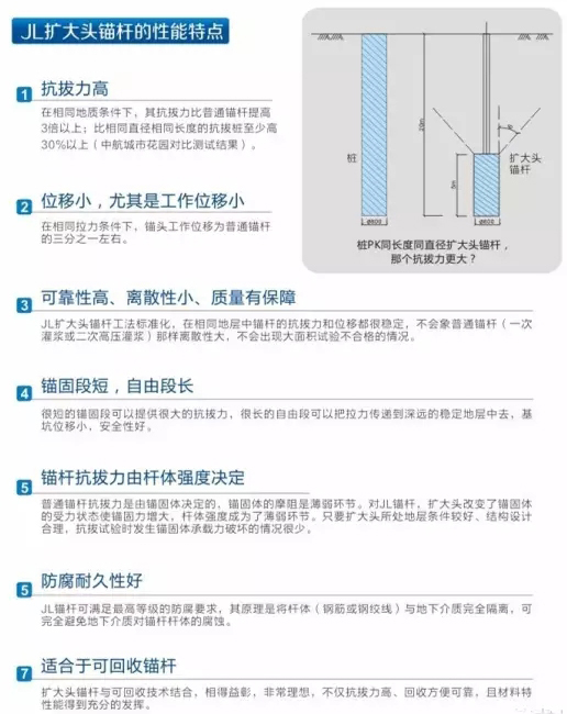 根据设计要求、土层情况和选用的工法,扩大头的直径范围为0.4m~2.0m,锚杆抗拔力比普通锚杆提高3倍以上;在相同的拉力条件下锚头工作位移仅为普通锚杆的1/3左右。普通锚杆为摩擦型锚杆,锚固体与孔壁之间不可避免地存在着一层或多或少的泥皮膜。JL扩大头锚杆为端压——摩擦型锚杆,高压喷射扩孔工艺对孔壁也有显著的加糙作用,因此他不仅抗拔力高、位移小,而且其最突出的有点是可靠性高,质量有保障。
