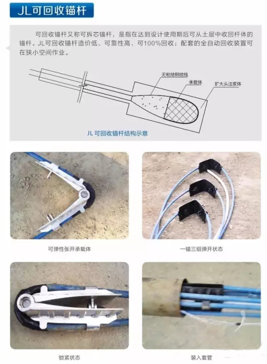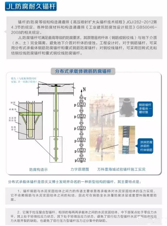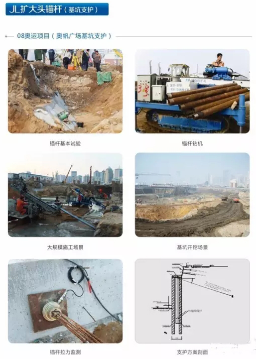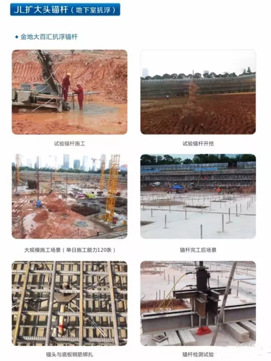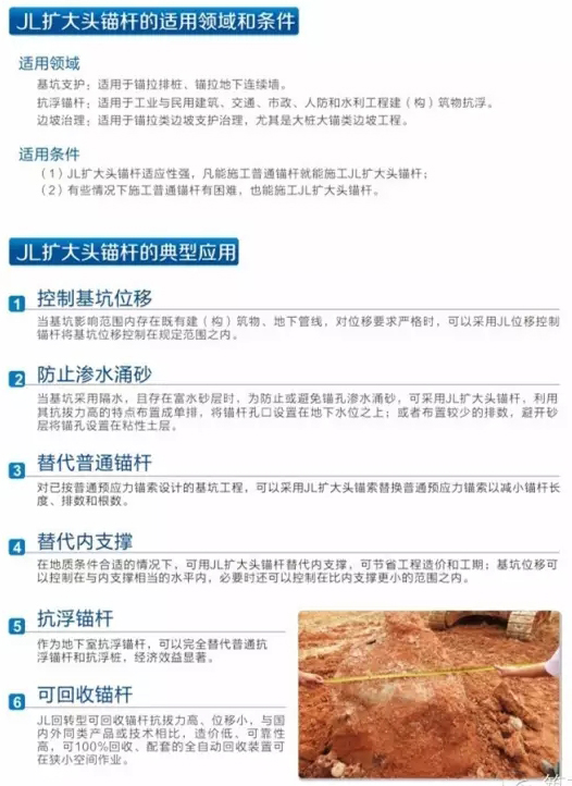 JL扩大头锚杆是采用高压喷射原理在锚孔底部一段长度范围内对孔壁土体进行切割扩孔并置换充填水泥浆形成一个圆柱状的扩大头。目前已形成了Acg、BWWcg、DWWcg等系列标准工法和设备配套,广泛适用于各种粘性土和砂土,且非常理想地解决了砂层塌孔的难题。