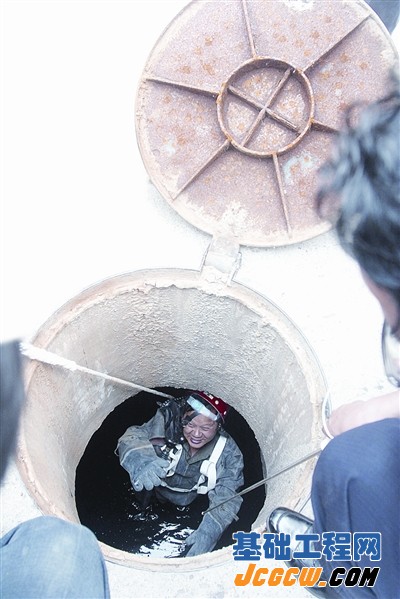 张猛穿好潜水服,戴上安全帽和防毒面具,背上氧气瓶,工友们还在他腰上系一根白色安全带。他抓着这道绳索缓缓下滑到污水中。瞬间,污水漫到他胸前,淹没了他的头……他下到的最深处达3米。