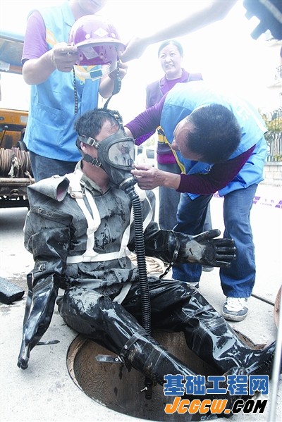 “哈!好香啊!”来不及卸下身上的装备,他先贪婪地猛吸了几口空气,似乎在地下已呆了好几年。在窨井里,尽管戴防毒面具、吸氧气,也挡不住那难闻的臭味。