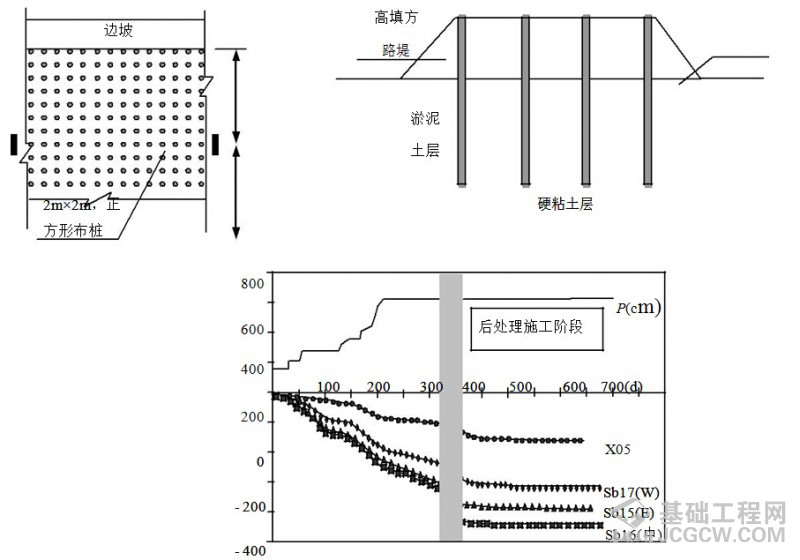 当时恰逢作者在湖北省交通厅系统进行水泥土桩复合地基技术的讲座交流活动,经项目部邀请,前往现场帮助参与解决问题。毫无疑问,最直接的解决问题办法是全部挖除已填路基后的“路改桥”方案。该方案安全可靠,但费用较大、工期无法满足指挥部要求。此后,我提出了采用本文方法进行处理,经过论证研究,指挥部采纳了这一方案。方案设计采用直径 400mm 无砂混凝土桩,桩长 18m,间距 2m 方形布置,桩底端进入好土层老黏土约 2m,如图 1。为确保施工期间路堤的稳定性,需均匀对称施工无砂混凝土桩,桩采用螺旋钻机取土成孔方式。成孔过程中,软弱土层中超孔隙水压得到迅速释放,路基固结沉降变形速率很快,加固施工大约 50 天期间,路基最大附加沉降为 300mm。可见,后处理技术的固结效果远好于单纯的堆载预压或真空预压和联合预压方法。检测结果显示工后 20d~30d,路基变形速度即达到规范规定的稳定标准。