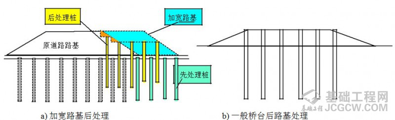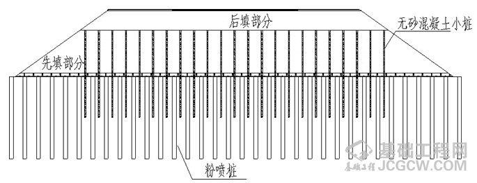 路基后处理技术是在已进行全部或部分填方路基填筑后施工无砂混凝土桩、CFG 桩或静压预制桩,尔后如图 2,再进行后填路基或垫层、路面结构等施工的路基处理技术。