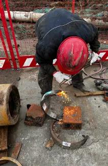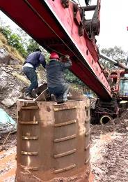 10月22日上午,我和喻以周老师前往工地。由于施工场地狭窄,一个桥梁承台上两台大型旋挖设备共同工作,一台挖机辅助施工,让本就狭小的空间更难施展开来。由于场地泥泞不堪,服务车根本不能进场,所以他使用的是工地上的电焊机,SR485为前趴机型,所以他不得不站在2米高的钻斗上焊接。先用割枪把裂缝割开,然后再进行焊接。他说为了桅杆不变形,轨道上必须先切割竖向焊缝,焊接好打磨平整,再切割其他两面,不然上桅杆的重量会把割出来的缝压缩导致桅杆变形。没想到喻以周老师不仅技术精湛,心还细!