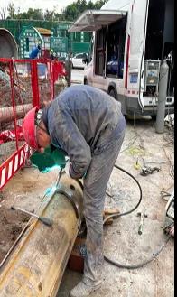 钻杆上的三条裂缝,由于上次更换键条,客户外找的师傅焊接,电流调大了温度过高,使钻杆原件变脆,虽然焊缝很漂亮,但是伤到原件了就不合格。客户听到这里对三一售后更加信赖,纷纷给喻以周老师竖起了大拇指。昨天,由于操作手失误将动力头油管管夹撞断,他顺手又给客户焊接好;下午18:00时,完成所有焊接工作。