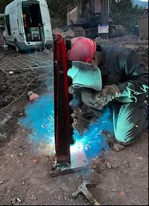 台上一分钟,台下十年功一点也没错呀!他从事电焊工作已有30余年,根据不同的材料,选择不同的焊接方式、焊接温度、电流电压的大小、手法角度等等……他都能掌控得十分精准。无论是方头或是钻杆,还是桅杆,他都不在话下。一上午完成桅杆焊接,中午休息片刻,他便又投入到焊接钻杆上。由于钻杆属于无缝钢管,所以使用二氧化碳保护焊,不仅不会夹渣,而且焊接速度快,成型好。设备把桅杆立起来便有了空间,挖机把场地平整后决定把服务车开进场。