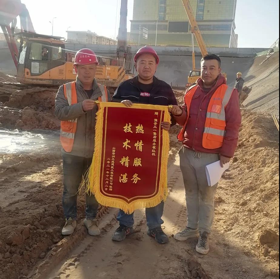 该客户是三一大客户,现有设备五台全是三一设备。经过这几年售后服务工作,客户一直对三一售后服务非常认可,日常点点滴滴的服务,不知多少次让客户感动,为此客户赠送锦旗一面。