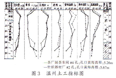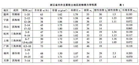 温州是我国著名的软土地区。地表仅有极薄的硬壳层,软土的埋藏浅、厚度大,各项土工指标与浙江的宁波、舟山、杭州及省外的上海、广州、福州、天津等地相比,多以温州的为最差(见图3、表1)。