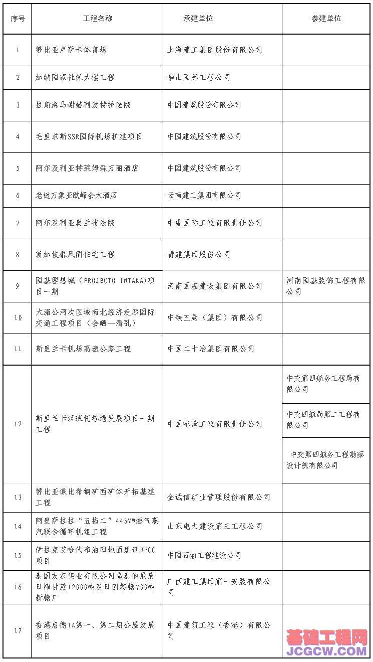 根据《关于开展2014年中国建设工程鲁班奖(境外工程)评选活动的通知》(建协〔2014〕20号),并参照《中国建设工程鲁班奖(国家优质工程)评选办法》(建协〔2013〕24号),经评审,赞比亚卢萨卡体育场、伊拉克艾哈代布油田地面建设EPCC项目等17项工程入选2014年中国建设工程鲁班奖(境外工程)。