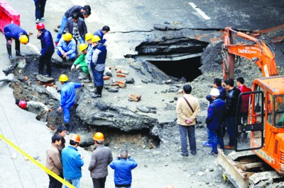 昨日凌晨2时左右,马鞍山路“巢湖路茶叶市场”门口出现塌陷,路面上呈现两个大洞,最深处达4米左右,塌陷范围近百平米。据了解,早在17日下午就有市民发现路面有裂缝,而供水集团也接到管网渗漏的报修并在此进行了施工,塌陷未造成人员伤亡。