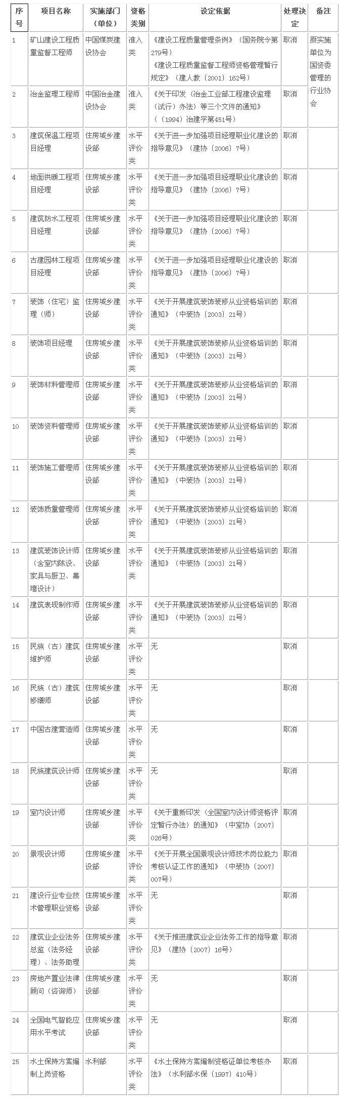 国务院决定取消的职业资格许可和认定事项目录(节选建筑工程相关部分)