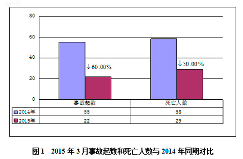 2015年3月,全国共发生房屋市政工程生产安全事故22起、死亡29人,比去年同期事故起数减少33起、死亡人数减少29人,同比分别下降60.00%和50.00%(见图1)。
