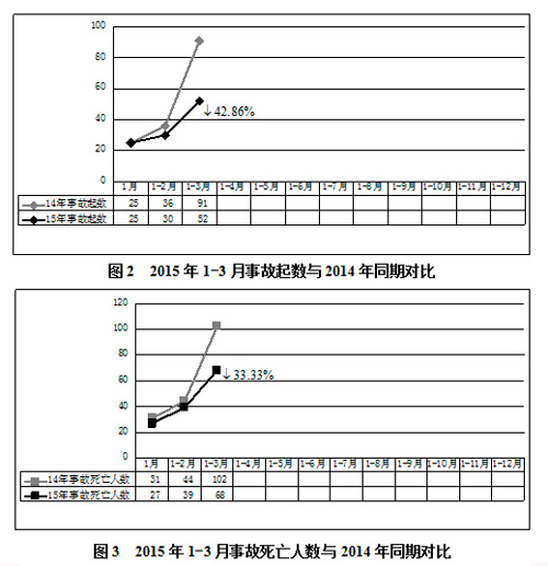 2015年1-3月,全国共发生房屋市政工程生产安全事故52起、死亡68人,比去年同期事故起数减少39起、死亡人数减少34人,同比分别下降42.86%和33.33%(见图2、图3)。