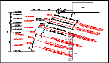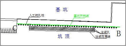 长沙恒大城基坑支护工程,该项目为两层地下室,处理段支护高度约9.0m,坡顶开裂地段采用“桩锚”支护形式,土质主要为回填土及粉质粘土。基坑施工完成后,因上部填土较厚,连日暴雨情况下,局部地段坡顶出现较为严重的变形。考虑基坑施工已完成,重新增补预应力锚索施工困难且工期较慢,针对该现场情况,在该处理段范围内采用坡顶注浆加固处理(见图2),即在坡顶设置3排垂直注浆孔,孔径110mm,孔底进入粉质粘土不小于1.5m,注浆孔间距1.0m×1.0m,注浆压力0.3~0.5Mpa,注浆花管设置注浆花眼,花眼直径5~8mm,每截面按120°布置3个,截面间距0.8m;注浆时,在坡顶及基坑侧壁进行观测,如有地面隆起或其它不利状况出现,应及时减小注浆压力,确保施工对周边环境无较大影响,注浆加固后,基坑稳定性控制良好,变形得以控制。在填土、砂性土等土层中,如出现类似情况,可采用坡顶垂直注浆、侧壁斜向注浆等加固措施进行处理。如土层与锚固体粘结强度较好,且锚索施工条件允许,也可增补预应力锚索处理,此时,一般情况下,增加的锚索尽量位于支护结构上部,有利于进一步控制变形。