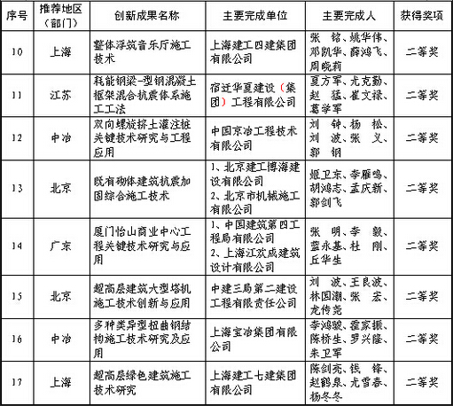 首届中国建设工程施工技术创新成果奖评选结果已揭晓,“装配整体式剪力墙结构工业化住宅综合技术研究与应用”等73项施工技术荣获首届中国建设工程施工技术创新成果奖,其中:一等奖4项,二等奖20项,三等奖49项。根据《中国建设工程施工技术创新成果奖评选办法(试行)》(建协〔2014〕17号)的有关规定,决定对获奖单位予以表彰,颁发荣誉证书,并向获得一等奖的单位颁发奖金。