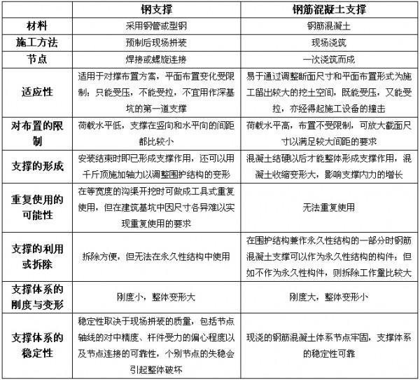 内支撑按材料分为钢支撑和钢筋混凝土支撑两种,可以采用单一材料,也可以混用。 两种材料的内支撑各有优缺点,比较见下表: 钢支撑和钢筋混凝土支撑的主要区别