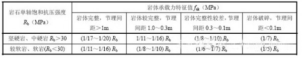 因此,只要知道岩体的承载力特征值,根据岩体的破碎情况,就可以通过下式计算出岩石的承载力。即: