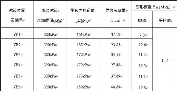 从检测结果看,YB2、YB6承载力特征值均超过180kPa,最小值只有161kPa,最大值只有185kPa,平均值有175kPa。最终沉降量最小值只有23.83mm,最大值只有44.89mm,平均值有32.64mm。变形模量Eo最小值只有9.2MPa,最大值12.6MPa,平均值有11.6MPa。从承载力特征值、最终沉降量、变形模量看,该强夯地基是不均匀的,但上述参数满足作为该建筑物地基承载力和沉降的要求。另外本次荷载摘的受荷面积只有0.50m2,比较小,加荷后影响的深度不会超过2倍承压的直径,而且加荷时间比较短,因此不能提供通过荷载板试验提供建筑物长期沉降的资料;当表层事浅层有一层“硬壳层”时,当采用小尺寸的承压板时,常常受压范围还在“硬壳层”内,其下软弱土层还未受到承压板的影响,而对于实际建筑物的大尺寸基础,下部软弱土层对建筑物沉降起主要的影响。因为时间及试验的原因本次平板载荷试验只做了6个点。