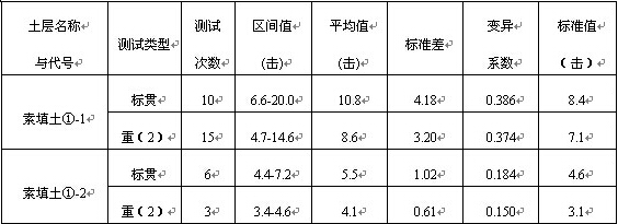 原位测试是指在保持岩土体天然结构、天然含水率以及天然应力状态的条件下,测试岩土体在原有位置上的工程性质的测试手段。原位测试不仅是岩土工程勘察的重要组成部分,而且还是岩土工程施工质量检验的主要手段。采用原位测试方法对岩土体的工程性质进行测定,可不经钻孔取样,直接在原位测定岩土体的工程性质,从而可避免取土扰动和取土卸荷回弹等对试验结果的影响。它的试验结果可以直接反映原位土层的物理力学性状。某些不易采取原状土样的土层(如深层的砂)只能采用原位测试的方法,原位测试还可在较大范围内测试岩土体,故其测试结果更具有代表性,并可在现场重复进行验证。场地内共布置钻孔14个,进行了孔内标准贯入试验16次,动力触探试验18段,素填土①-1、素填土①-2的锤击数统计如下表3,其承载力特征值为165kPa。