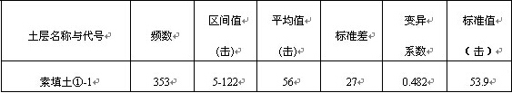场地内共布置轻探试验点40个。轻探试验锤击数统计如下表4,其承载力特征值为164kPa。