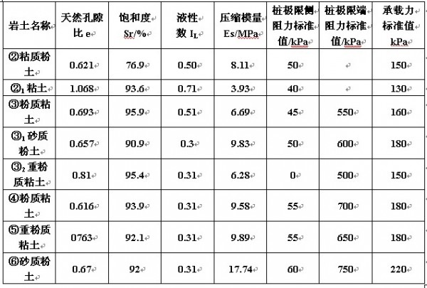 根据勘察报告资料,场地内地层自上而下分布有:①层素填土,厚度一般0.3~2.7m;①1层杂填土,厚度0.3~3.6m;②层粘质粉土,厚度3.2~7.4m;②1粘土,本层厚度0.3~1.7m③层粉质粘土,厚度0.5~6.0m;③1层砂质粉土,厚度0.5~2.5m;③2重粉质粘土、粘土,厚度0.5~3.5m;④层粉质粘土,厚度3.0~3.8m;⑤层重粉质粘土,厚度3.1~3.3m;⑥层砂质粉土,最大揭露厚度1.2m;各层土的物理力学性质指标见表1。场地内有第一层水为潜水,稳定水位埋深5.0m~7.0m,水位标高为36.01~39.30m;第二层为层间水,稳定水位埋深13.3~13.4m,水位标高为30.31~30.62m。场地地下水对混凝土无腐蚀性。