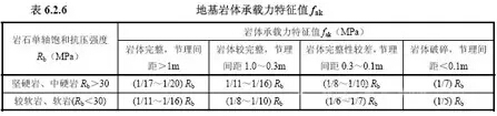 而根据《FD003-2007风电机组地基基础设计规定(试行)》第6.2.6条:地基岩体承载力特征值可根据岩石饱和单轴抗压强度、岩体结构和裂隙发育程度,按表6.2.6做相应折减后确定;对极软岩可通过三轴压缩试验或现场载荷试验确定其承载力特征值。