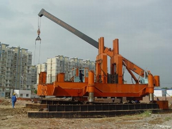 作业时,将桩置于压梁下,压梁两侧都装有压桩滑轮组。钢丝绳从卷扬机引出,绕过桩架顶梁上的导向滑轮,再顺次绕过压梁上的动滑轮和桩架底部的定滑轮,卷扬机卷进钢丝绳,逐步将压桩滑轮组收紧,通过压梁将整台压桩机的重量和配重施加于桩顶上,克服桩与土壤间的摩擦阻力,将桩逐渐压入土中。桩架顶梁上有起升滑轮组,用以吊桩就位,桩架中间有龙门,以导引沉桩方向。钢丝绳穿绕必须合理,使受力均衡。两台卷扬机力求同步。为抵消牵引速度的差异,顶梁上有平衡滑轮组,并将左右两压桩滑轮组的钢丝绳相联。桩架下部两侧为敷设有铁轨的船形轨座。桩工机械作业时,吊起轨座,整机支承在中央机座上。移位时,两侧轨座前移搁地,行走轮在铁轨上滚动。适合在粘土、淤泥土和砂土中压设混凝土桩和钢桩。