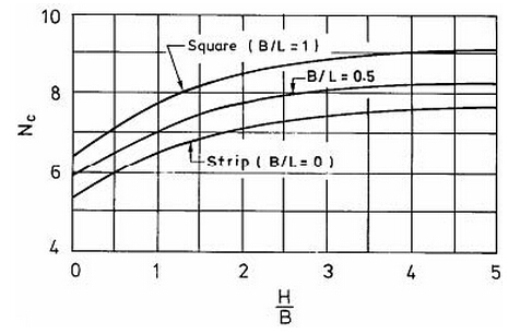 •Skempton(1951)提出了考虑基坑形状及尺寸影响的承载力系数Nc值;