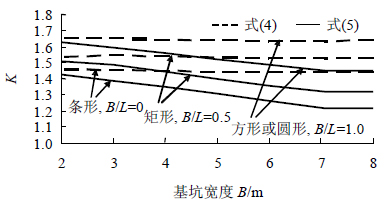调整后的抗隆起稳定安全系数受基坑宽度的影响