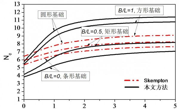 •可以近似地考虑基坑形状对稳定性的影响,但计算Nc值时采用的方法是不严谨的。
