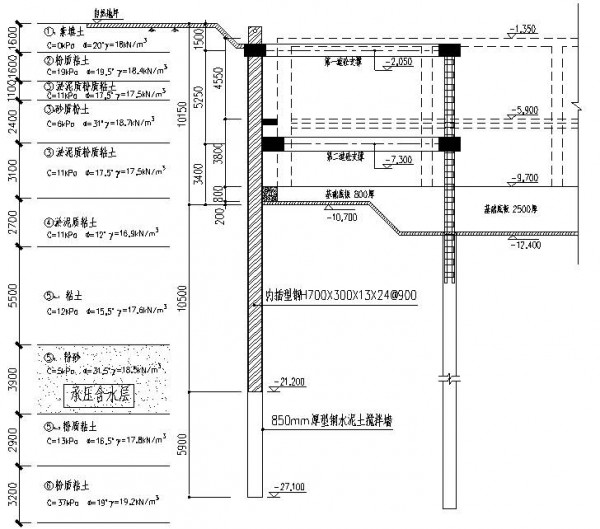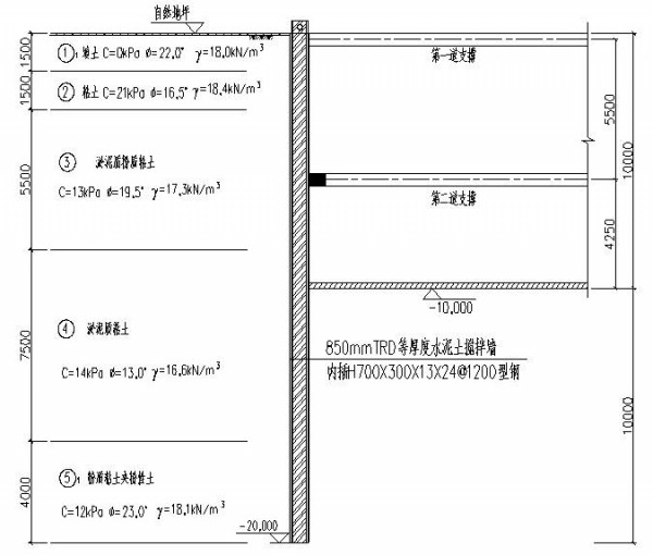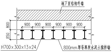 基坑挖深:10m,围护结构:850mm厚的等厚度水泥土搅拌墙、内插H700×700×13×24型钢、间距为1.2m