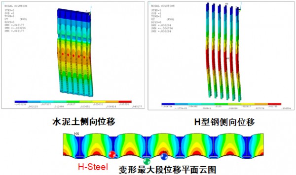 墙底部和顶部附近,型钢和水泥土间的侧向变形较一致。越接近坑底,型钢和型钢间水泥土的变形差异越明显。