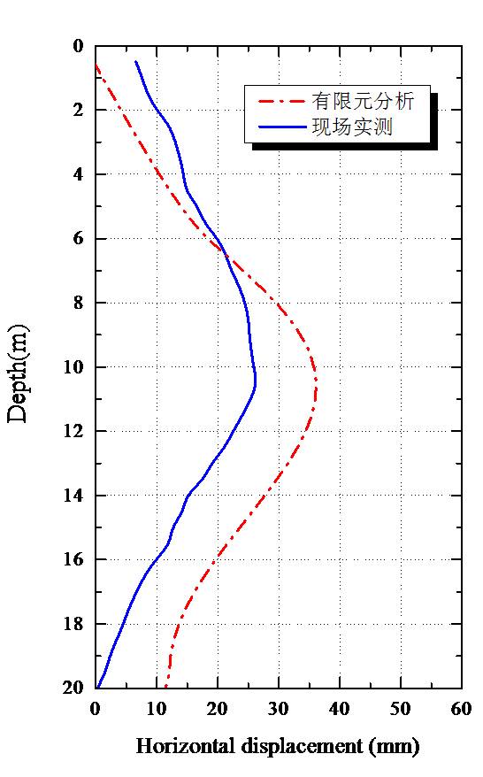 •计算位移稍大于实测值:在现场监测时,一般将围护体(型钢)底部作为水平位移的零点处理,而在三维“m”法计算中,围护体底部并未约束底部水平位移,因此在接近围护体底部的实测和计算位移有一定的差异。