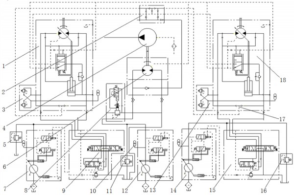 1,6,18双向变量马达;2集流阀;3,13平衡阀;4泥浆泵;5,11,16溢流阀;7,12,14变量泵;8溢流压力平衡阀;9,15多路阀;10蓄能器;17梭阀