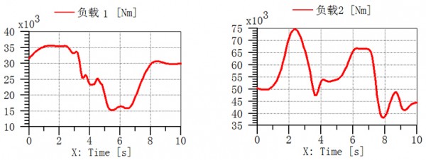 在外负载条件相同的情况下,设定泵的排量最大,改变控制换向阀阀芯开度的信号大小,改变马达的流量,如图3分析对比重载和轻载两种工况,对系统产生的影响。负载1变化范围为0-35kN.m,负载2的变化范围为35-75kN.m,设定系统仿真时间为10s。