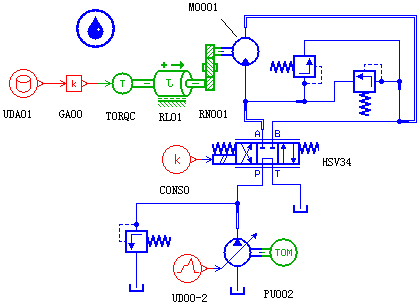 两个铣削轮采用单独油泵独立供油,主油路独立,故只对单个铣削轮液压系统进行建模,根据图1铣削轮液压系统的原理图,在AMESim仿真软件草图模式下建立系统的模型,其仿真模型如图2所示。