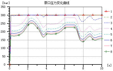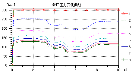 发动机开始启动的瞬间,泵受到很大的冲击,此时泵的出口压力迅速增加如图4所示,受到负载的冲击,泵口压力也在波动,由此说明系统中泵的响应速度快。阀口开度在12.5%和25%时,即曲线1和曲线2,系统压力达到设定的系统压力300bar,当压力超过300bar时,溢流阀打开,开始泄油,保证系统压力不高于300bar。而阀口开度在100%时,即曲线8,系统压力不超过250bar。