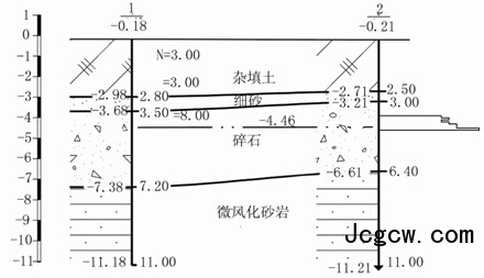 根据现场的岩土工程勘察报告,该场地范围内的土层自上而下为:(1) 层杂填土:层厚为2.5~3.0 m,杂色,松散,稍湿,成分以回填粉粘土为主,内含建筑垃圾、生活垃圾、少量碎石、砖块等;(2)细砂:层厚0.5~0.9 m。褐色,松散~稍密,稍湿。分选较好,磨圆度一般,级配一般。成分以石英为主。(3)碎石:层厚为2.5~3.7 m。褐色;稍密~中密;湿~饱和;(4) 微风化砂岩:浅褐色。原岩层状构造,具有近水平层理。矿物成分以石英、长石为主,钙质胶结(如表1、图2所示)。