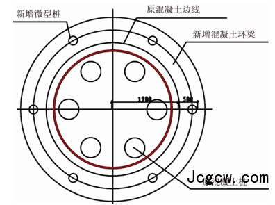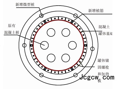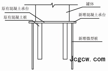 在带有旋转设备的罐体的改造过程中,经常会遇到因基础水平承载力不足而导致罐体振幅过大,影响罐体的使用,此时需要对罐体基础进行加固处理。常用的方法有复合注浆加固法,增大基础底面积法和微型桩托换加固法,而微型桩托换加固法具有承载力高、沉降量小、施工简单等优点