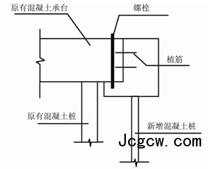 因为原有混凝土承台面积较小,混凝土强度很难达到设计要求,并且不易于施工,所以增大原有钢筋混凝土承台的底面积,在新浇筑混凝土基础中设置微型桩,(如图5、图6)。新旧混凝土之间通过钢筋与螺栓链接(如图7)。