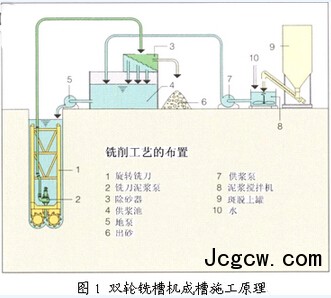 双轮铣槽机为液压式操作机械,它的工作原理为泥浆反向循环(图1)。成槽时两个铣轮连续的切削泥土和岩石,铣削下来的碎块和渣土与成槽泥浆混合。通过刀架上的泥浆泵,将这些含有碎块的泥浆泵进泥浆循环设备,再经过振动除砂系统,将泥土和岩石碎块与泥浆分离,最后将处理后的泥浆重新抽回槽中循环使用。