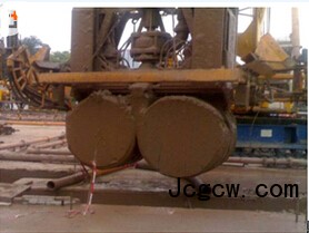粉砂质泥岩该层土质颗粒细小,泥质、钙质量大,浸水软化,在成槽过成中,岩层中的泥质、钙质易以胶体形态融入泥浆中,使泥浆的比重和粘性大幅增加,常规的对泥浆进行分筛或沉淀处理措施很难改善泥浆性能。该岩层为软岩,岩性表现为塑性,在双轮铣进行成槽铣削时,岩层很难以块状脱落,往往只是在岩层面形成一道道划痕,铣齿未铣削到的地方就会越来越高,最后将整个铣轮托住,致使铣轮无法进尺。在该岩层成槽作业中,更为严重的是:随着泥浆中泥质、钙质含量的增多,泥浆的粘性增加,泥浆的携渣能力就越高,铣削下来的砂砾岩不能及时的分离出去,从而使整个铣轮逐渐的被粘泥糊住,最终铣轮失去对岩层的破碎功能。铣轮糊泥现象如图3