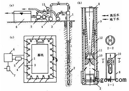 1.喷射井管2.滤管3.供水总管4.排水总管5.高压离心泵6.水池7.排水泵13.压力表