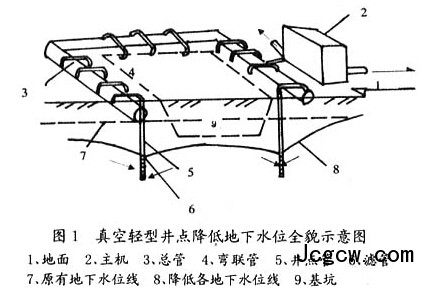 喷射井点:喷射井点降水是在井点管内部装设特制的喷射器,用高压水泵或空气压缩机通过井点管中的内管向喷射器输入高压水或压缩空气形成水气射流,高压水或气经节流流速加快,压力降低后,又扩流流速减慢,压力提高,形成真空。喷射井点系统能在井点底部产生250mm水银柱的真空度,将地下水经井点外管与内管之间的间隙抽出排走。