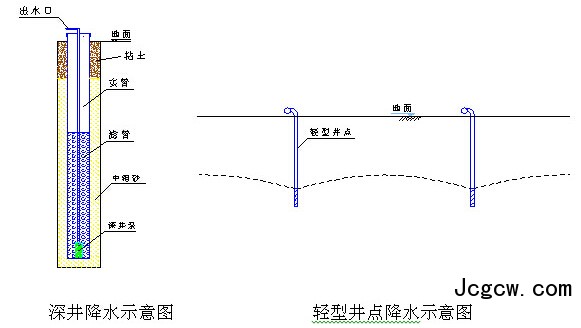 当降水超过15m时,在管井井点采用一般的潜水泵和离心泵满足不了降水的要求,可加大管井深度,改采用深井泵即深井井点来解决。深井井点一般可降低水位30--40m,有的甚至可以达到100m以上。常见的深井泵有两种类型:电动机在地面上的深井泵及深井潜水泵(沉没式深井泵)。