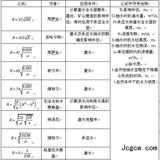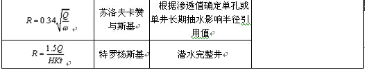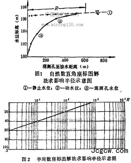 确定影响半径的方法很多,在矿坑涌水量计算中常用库萨金和吉哈尔特经验公式作近似计算。当设计的矿山进行了大降深群孔抽水试验或坑道放水试验时,为了推求较为准确的影响半径,可利用观测孔网资料为基础的图解法进行推求。