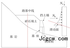 贵州省驾荔(驾欧—荔波)高速公路YK17+465~YK17+540段以相邻隧道的碎石洞渣为路堤填土,并采用挡土墙+抗滑桩的联合支挡结构对路堤右方进行支挡,是典型山区公路支挡工程。图1为典型支挡断面及抗滑桩受力示意图,其中重力式挡土墙由C15片石混凝土浇筑而成,高10 m,长36 m。抗滑桩采用钢筋混凝土,混凝土强度等级C30,截面尺寸为2.4 m 1.8 m,长16 m。此时,抗滑桩不仅受到水平方向边坡推力Nh的作用,同时还受到挡土墙传来的竖向荷载Nv的作用。