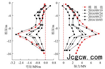 图4为抗滑桩内力数值模拟结果与现场试验结果对比曲线。由实测数据可知,随路堤填筑高度增加,抗滑桩桩身弯矩及轴力不断变大,路堤填筑完成后(2014/10/23)在滑面所在位置(桩深10 m处)分别达到最大值2.76 MN•m和7.08 MN,其中由挡土墙传至桩顶的荷载约为1 MN,占最大轴力的14%。根据理论计算,由重力荷载在滑面处桩身产生的轴力为1.08 MN,因此抗滑桩最大轴力的71%是由水平推力产生的,说明抗滑桩以承受水平荷载为主。对比路堤填筑完成时抗滑桩内力的实测值和模拟值,可以看出数值模拟结果与实测值吻合较好,验证了该模型的合理性,因此可用于桩墙联合支挡结构中抗滑桩受力状态及破坏形式的进一步研究。