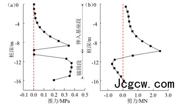 图5为抗滑桩桩前推力及剪力随桩深变化曲线。在桩埋深0~9 m处,抗滑桩桩前推力随桩深的增大而增大,在滑动面附近1 m处,桩前推力为0,随着桩深的进一步增加,桩前推力先增大后减小,最大推力为0.35 MPa(图5(a))。桩身剪力随桩深呈增大-减小-再增大的规律,非锚固段桩身剪力随桩深的增大而单调递增,在滑面所在位置达到最大值2.4 MN(图5(b))。